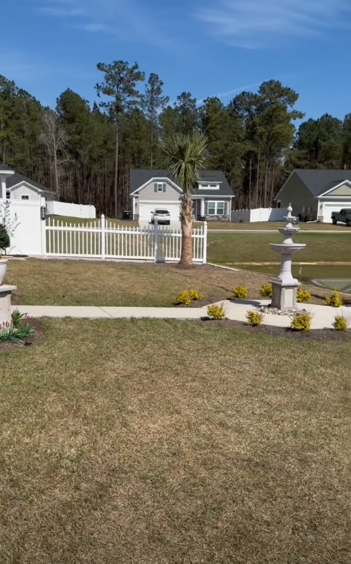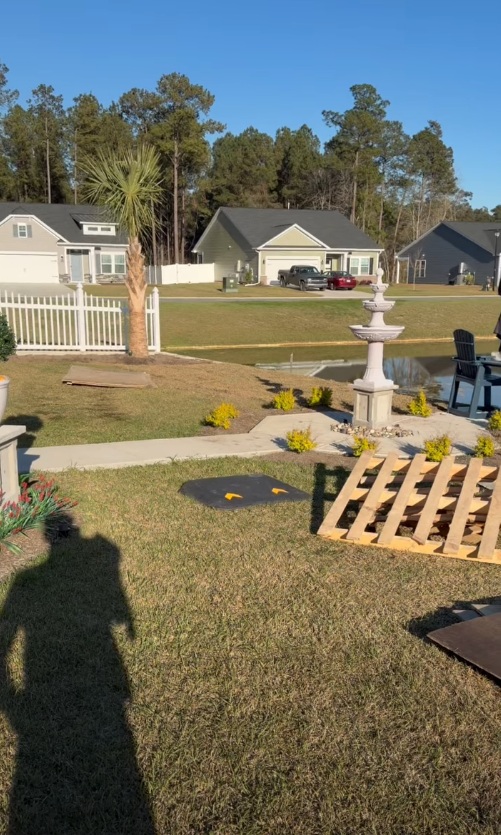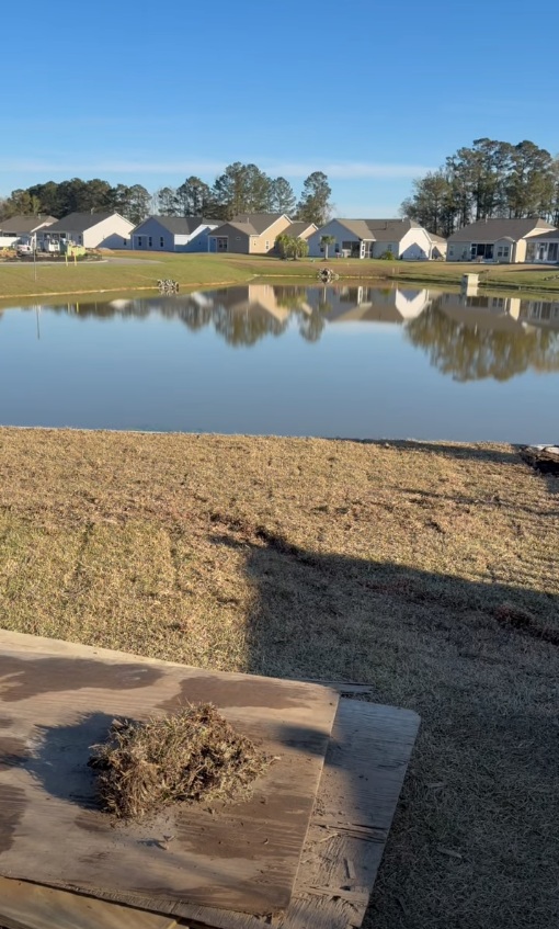 The coastal Carolina region receives significant annual rainfall, often in concentrated heavy events. A yard without proper grading and drainage can develop standing water, foundation runoff issues, and erosion channels that get worse every storm season. The grading work on this project ensures water drains away from the home and toward the natural drainage point at the pond — not back toward the house or pooling in the middle of the yard.