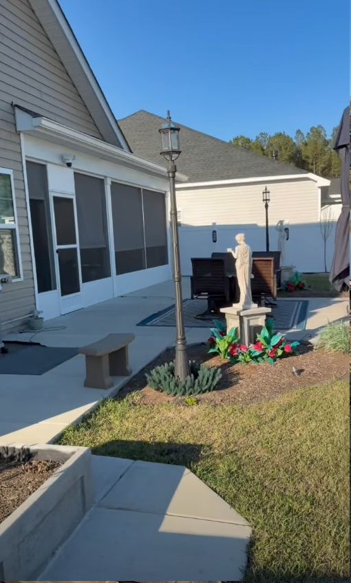 On both the left and right sides of the backyard, we built out defined landscape beds — giving the yard clear edges and dedicated planting zones that frame the central walkway and hold their shape through coastal weather. In the sandy soil common throughout Calabash, Shallotte, Sunset Beach, and Ocean Isle Beach, undefined yard edges erode quickly after heavy rain. Properly built and edged landscape beds prevent that erosion and keep the yard looking intentional season after season.