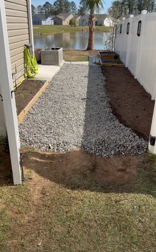 Crushed stone walkway running along the side of the home, providing a clean defined path between the house and fence line.